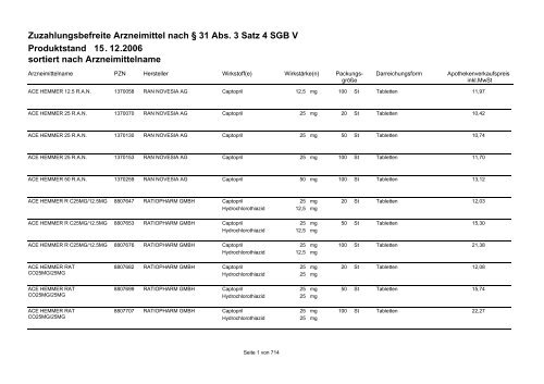 Zuzahlungsbefreite arzneimittel nach 31 abs 3 satz 4 sgb v. 3 satz 4 sgb v arzneimittelname pzn hersteller darreichungsform apothekenverkaufspreis inkl mwst packungs größe wirkstoff e wirkstärke n produktstand sortiert nach arzneimittelname 15. 3 satz 4 sgb v arzneimittelname pzn hersteller darreichungsform apothekenverkaufspreis inkl mwst packungs größe wirkstoff e wirkstärke n produktstand sortiert nach arzneimittelname 01. 1370058 ran novesia ag 100 stcaptopril 12 5 mg tabletten 12 28. 1 satz 2 nr.
